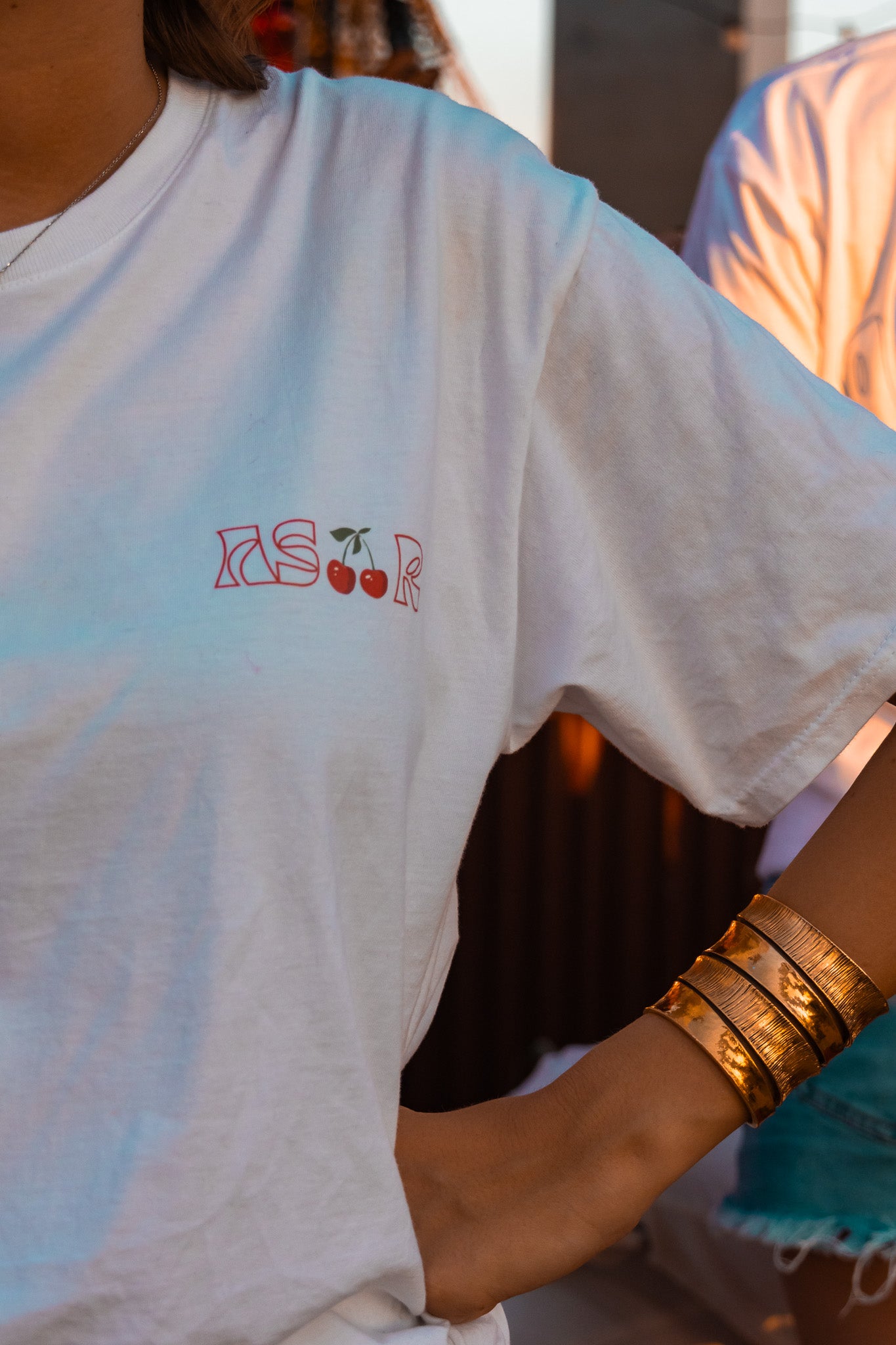 Ce tee-shirt blanc 100 % coton séduit par sa coupe légèrement oversize et son motif fruité discret mais audacieux. Une touche de fraîcheur à glisser dans toutes vos tenues.